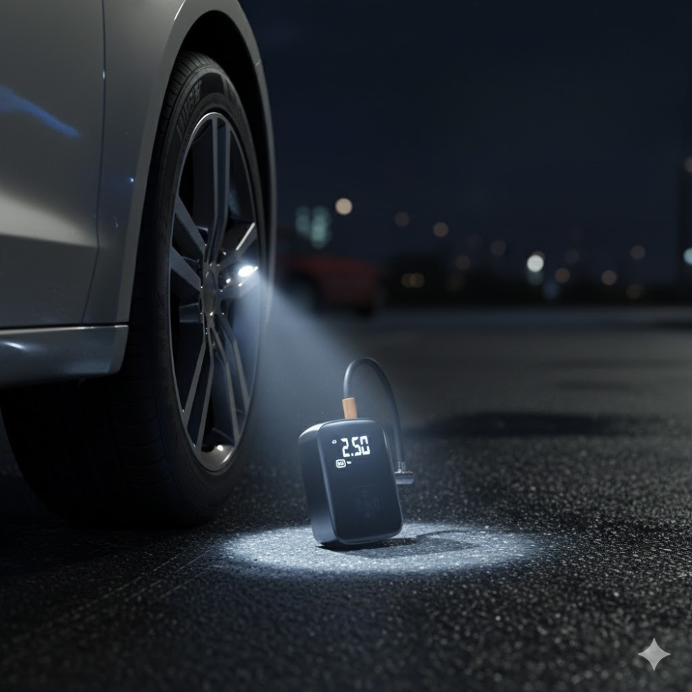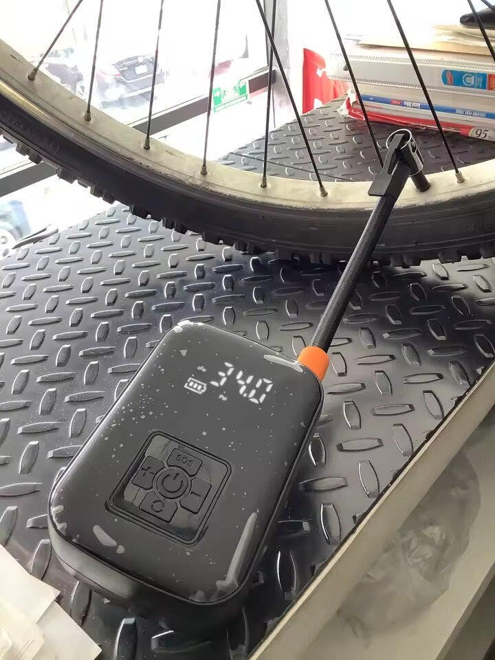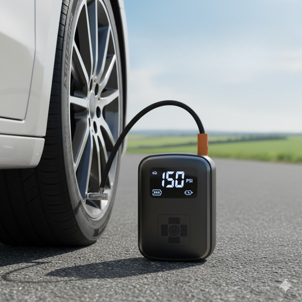 La pompe délivre 100 W et 150 psi de pression, idéale pour pneus de voiture, moto, vélo ou équipements sportifs.